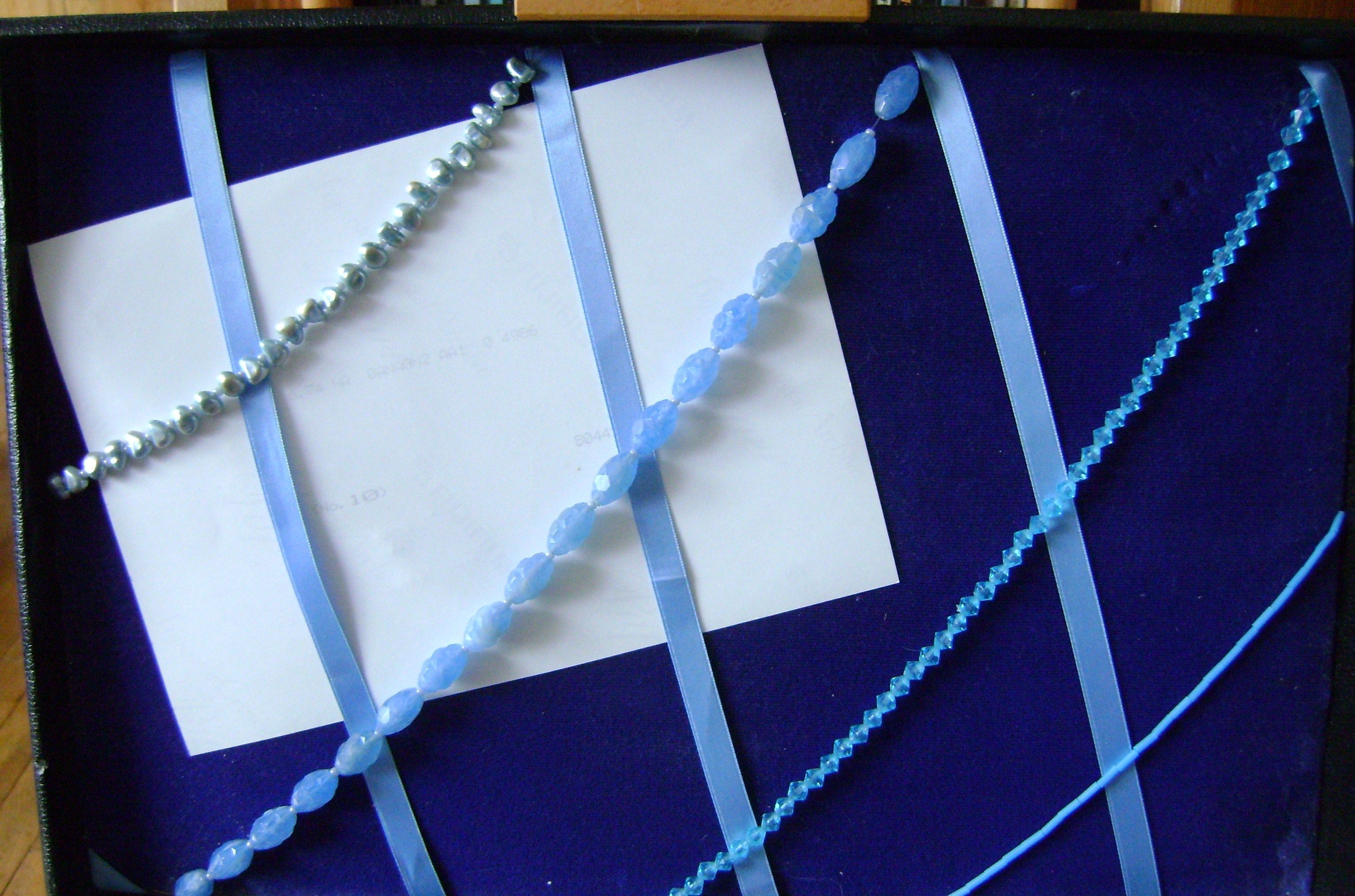 Former des croisillons avec du ruban satin et des colliers de différentes perles.. Fixer ces croisillons en les collant derrière le carton.